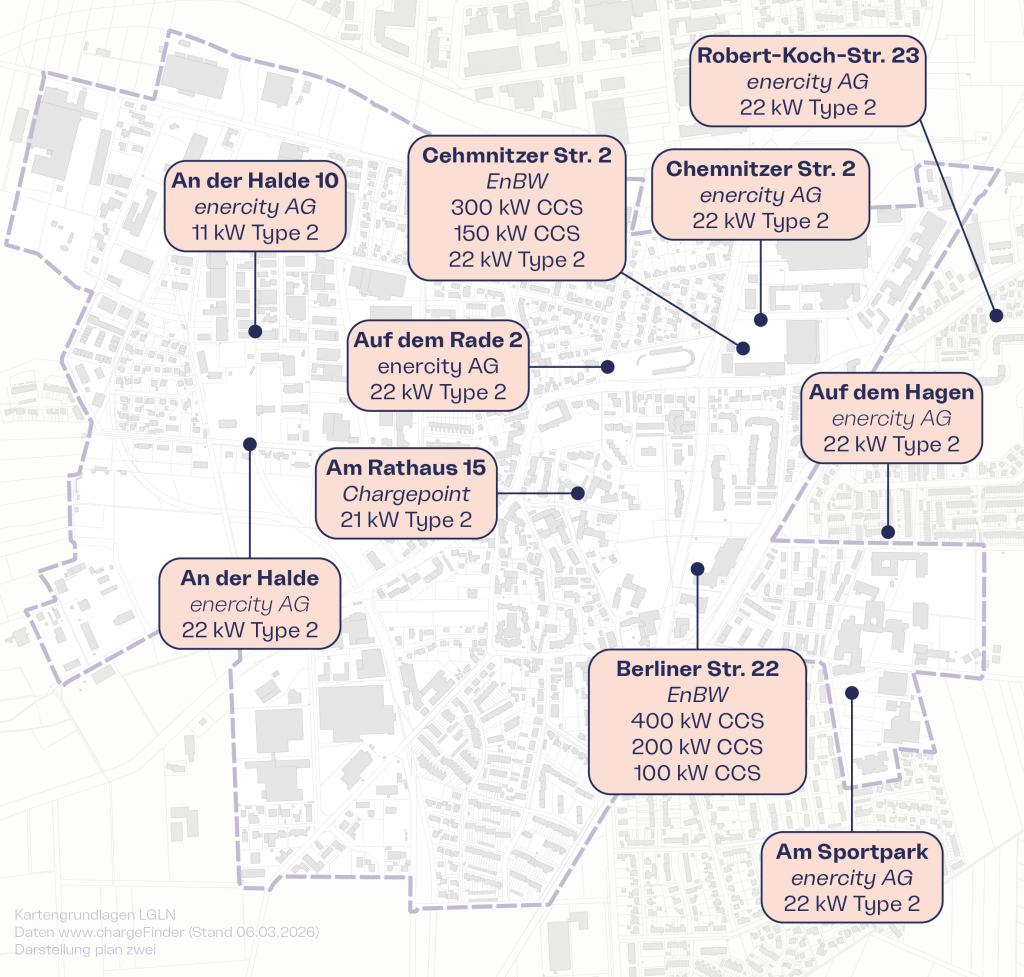 Mittlerweile gibt es an siebzehn Standorten im Stadtgebiet insgesamt 45 öffentliche Ladepunkte mit einer Leistung von 3.938 kW. Darunter sind auch mehrere Hypercharger. Details zu den Ladepunkten sind beispielsweise hier einsehbar.