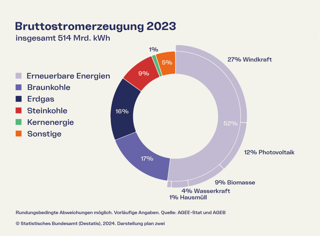 Laut Statistischem Bundesamt stammt aktuell bereits etwas mehr als die Hälfte (52 %) des Stroms, der in Deutschland erzeugt wird, aus erneuerbaren Energiequellen.