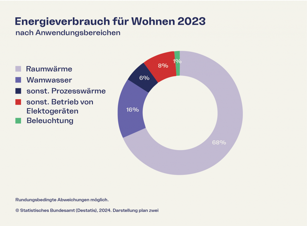 Knapp zwei Drittel (68 %) des Energieverbrauchs fürs Wohnen entfallen auf die Raumwärme, weitere 16 % auf den Warmwasserverbrauch, so zeigen es die aktuellen Zahlen des Statistischen Bundesamts. Je nachdem, mit welchem Energieträger und mit welcher Heiztechnik (z.B. Gas-Brennwertheizung oder Sole-Wasser-Wärmepumpe) man seine Räume erwärmt, hat das einen großen Einfluss auf den individuellen CO2-Ausstoß und darauf, wieviel Geld man fürs Heizen ausgeben muss. Weitere Faktoren wie beispielsweise das Baujahr (und somit Effizienz) der Heizanlage, die energetische Qualität der Gebäudehülle und das persönliche Heiz- und Lüftungsverhalten haben ebenfalls Einfluss auf den individuellen Energieverbrauch. Technische Einbauten wie Lüftungsanlagen mit Wärmerückgewinnung können den CO2-Ausstoß in Wohngebäuden verringern.
