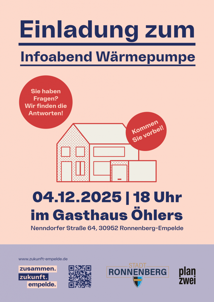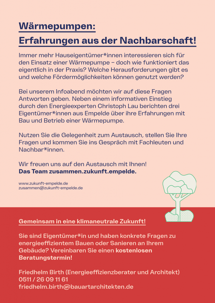 Nach einem einführenden Vortrag des Energieexperten Christoph Lau berichten Eigentümer*innen aus Empelde über ihre persönlichen Erfahrungen mit Planung, Einbau und Betrieb einer Wärmepumpe. Im Anschluss besteht die Möglichkeit, Fragen zu stellen und mit Fachleuten sowie Nachbarinnen und Nachbarn ins Gespräch zu kommen.